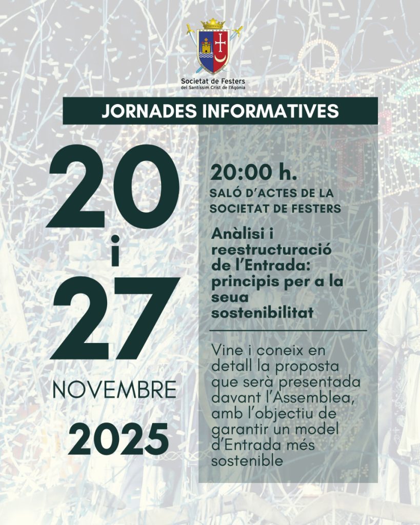 La Festa evoluciona, i els temps ens demanen reflexió, rigor i compromís. Per això, la Societat de Festers presenta una proposta destinada a garantir una Entrada més sostenible, equilibrada i brillant per a tots. 👉 Vine i coneix en detall la proposta que es presentarà davant l’Assemblea. 🗓️ 20 i 27 de NOVEMBRE 📍SALÓ D’ACTES DE LA SOCIETAT DE FESTERS ⏰ 20:00 H.